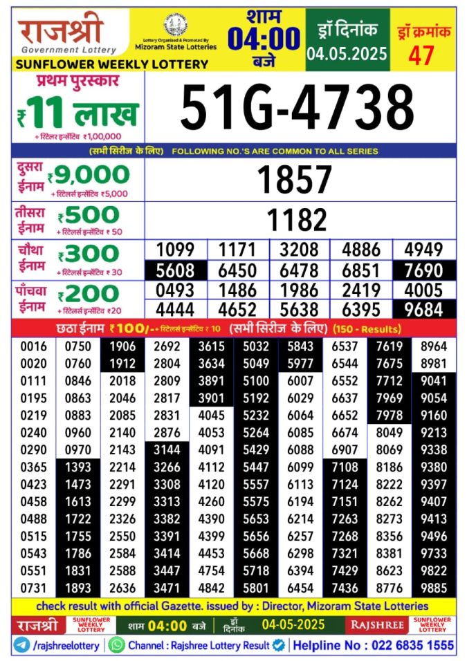 Rajshree sunflower 4pm weekly lottery result 4/05/2025