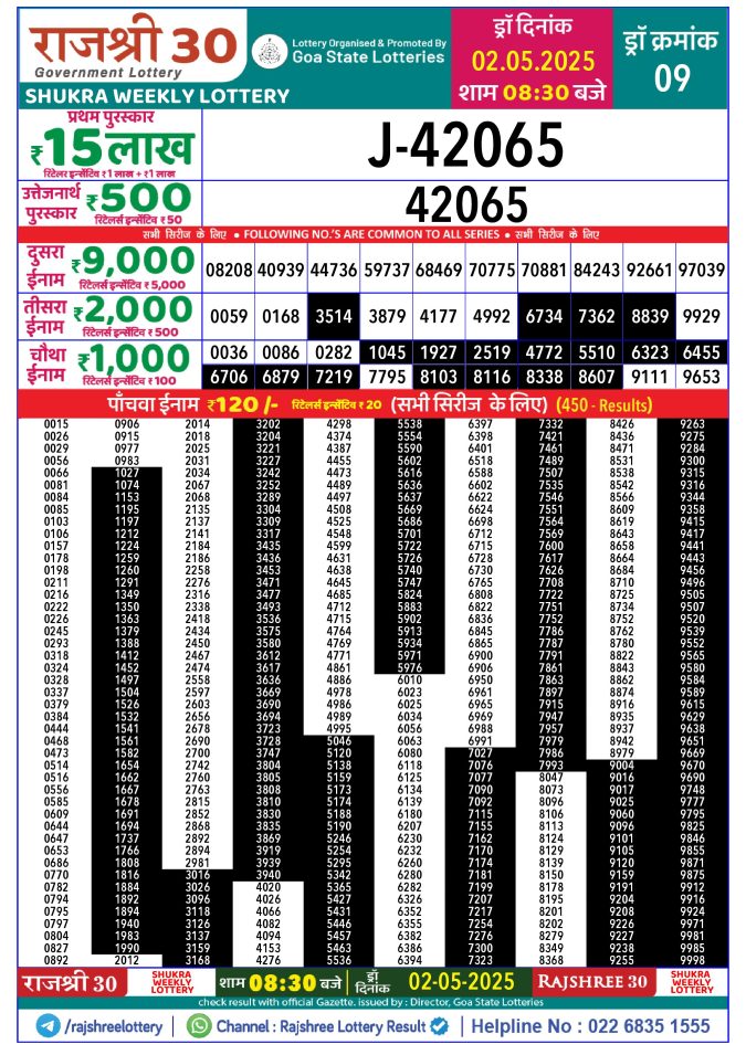 Rajshree 30 shukra 8.30pm weekly lottery result 2/05/2025