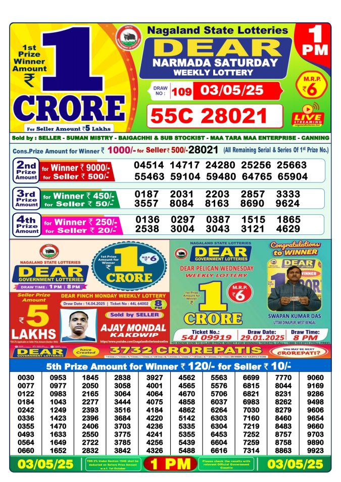 Dear narmada 1pm saturday weekly lottery result 3/05/2025