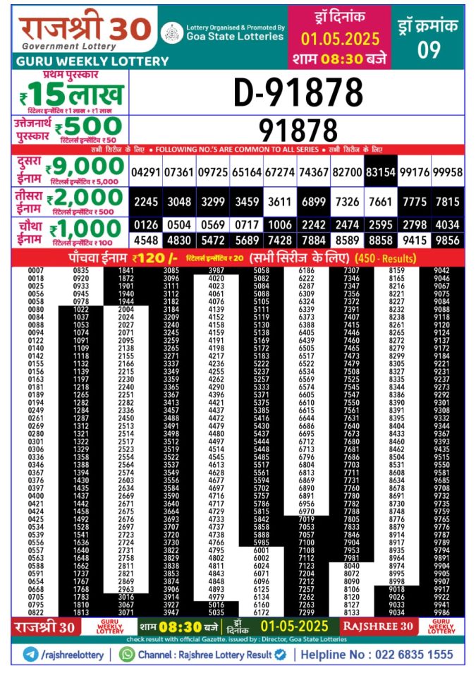 Rajshree 30 Guru 8.30pm weekly lottery result 1/05/2025