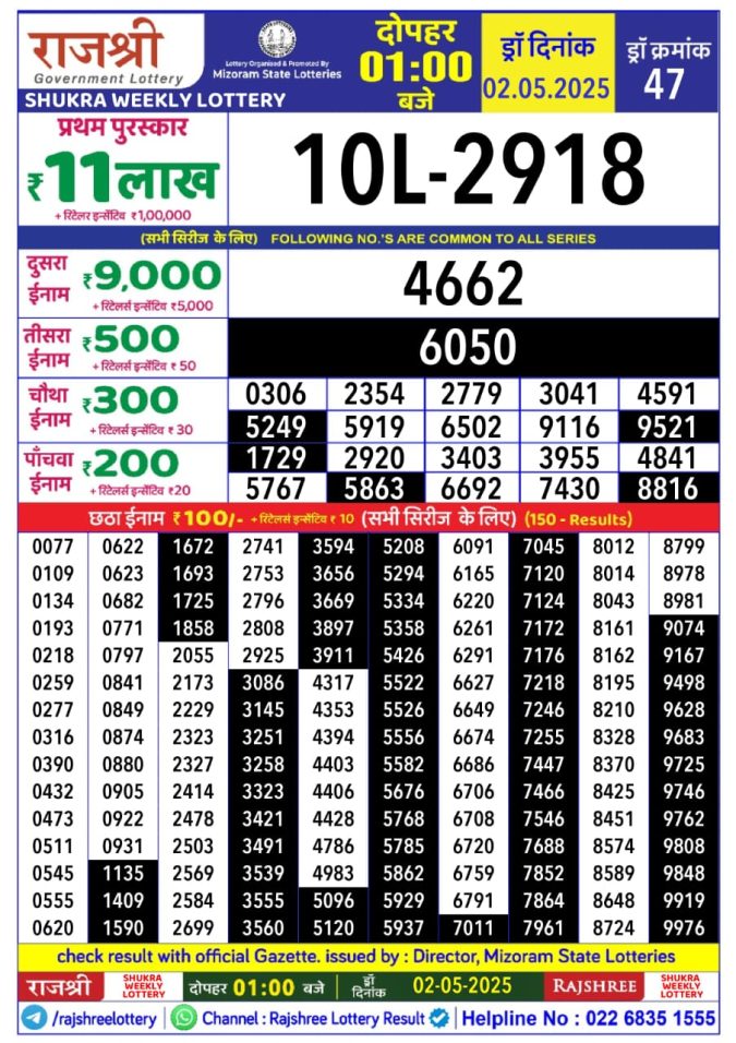 Rajshree shukra 1pm weekly lottery result 2/05/2025