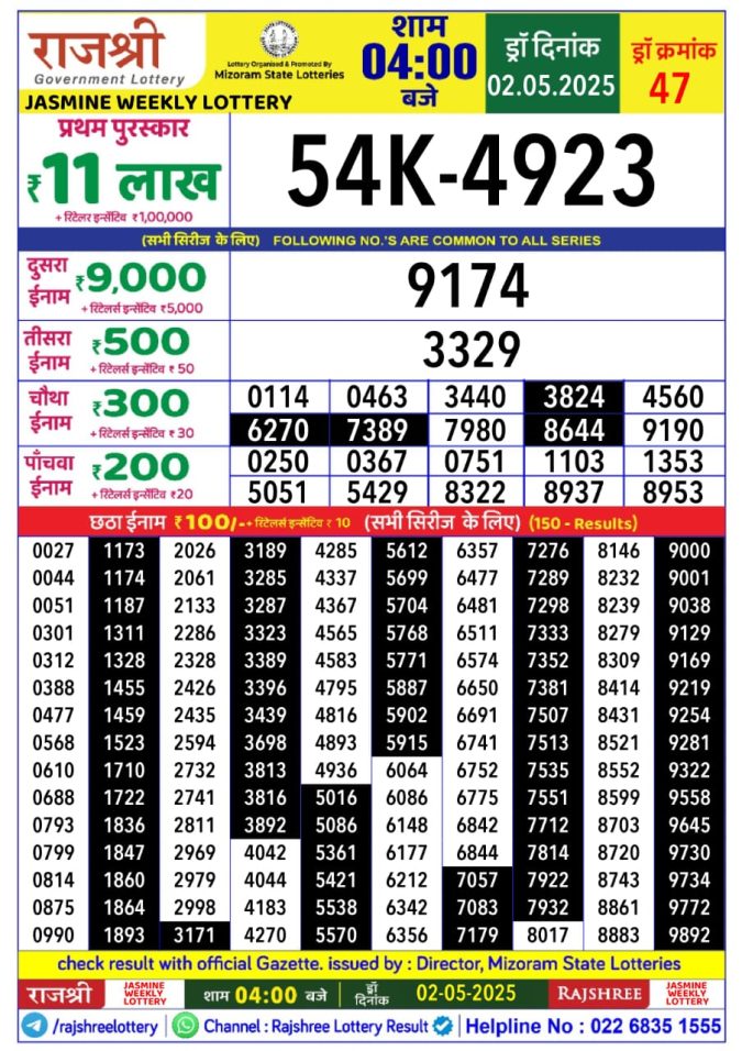 Rajshree jasmine 4pm weekly lottery result 2/05/2025