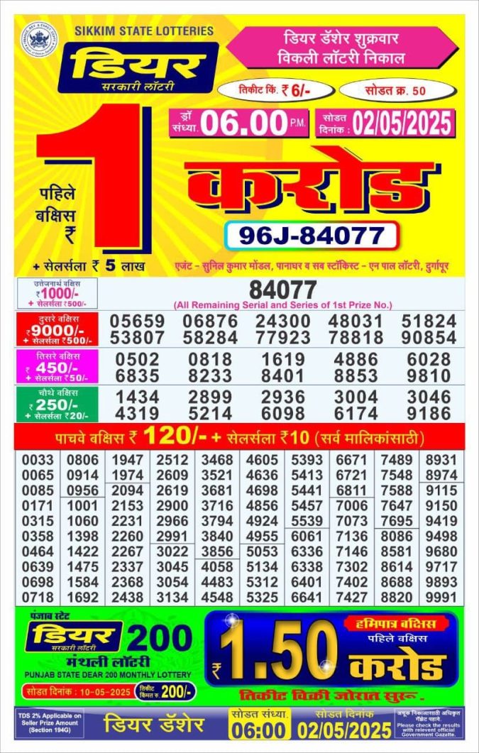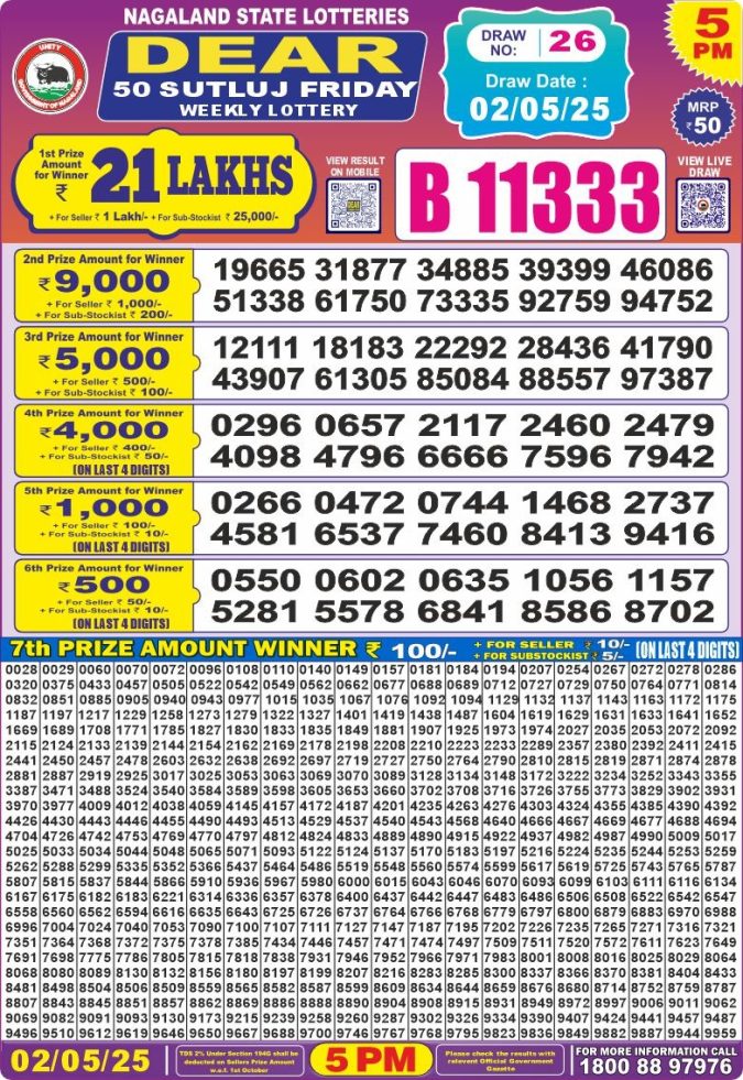 Dear 50 satluj 5pm Friday weekly lottery result 2/05/2025