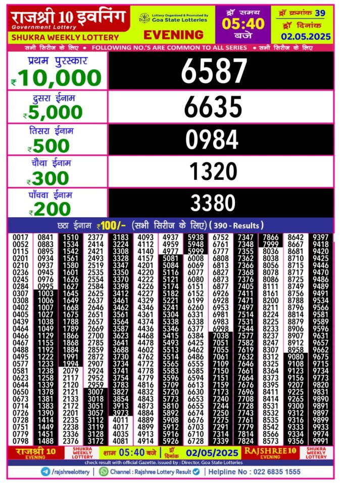 Rajshree 10 evening shukra weekly lottery result, 5.40pm, 2/05/2025