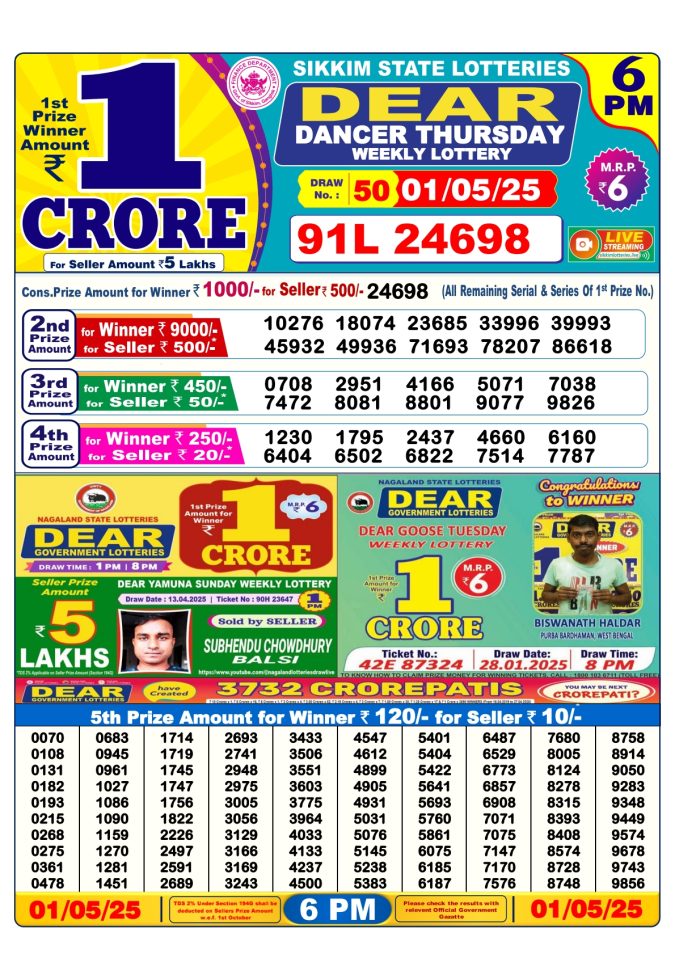 Dear super platinum 7pm Thursday weekly lottery result 1/05/2025