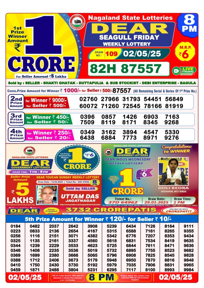 Dear seagull 8pm Friday weekly lottery result 2/05/2025