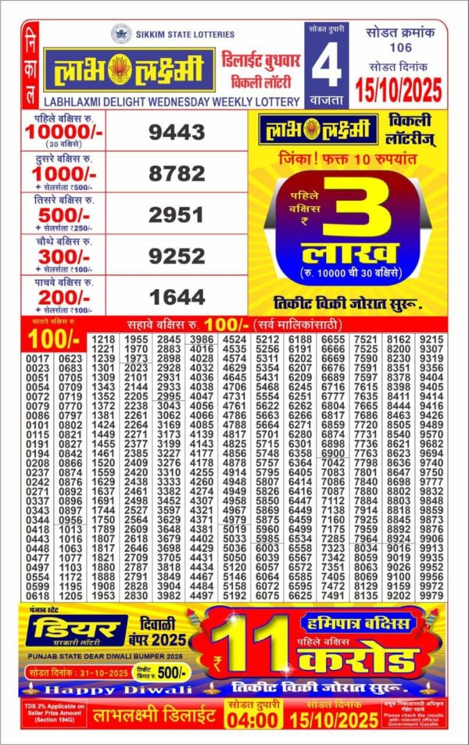 Labh Laxmi Delight 4pm Wednesday Weekly Lottery Result 15/10/2025