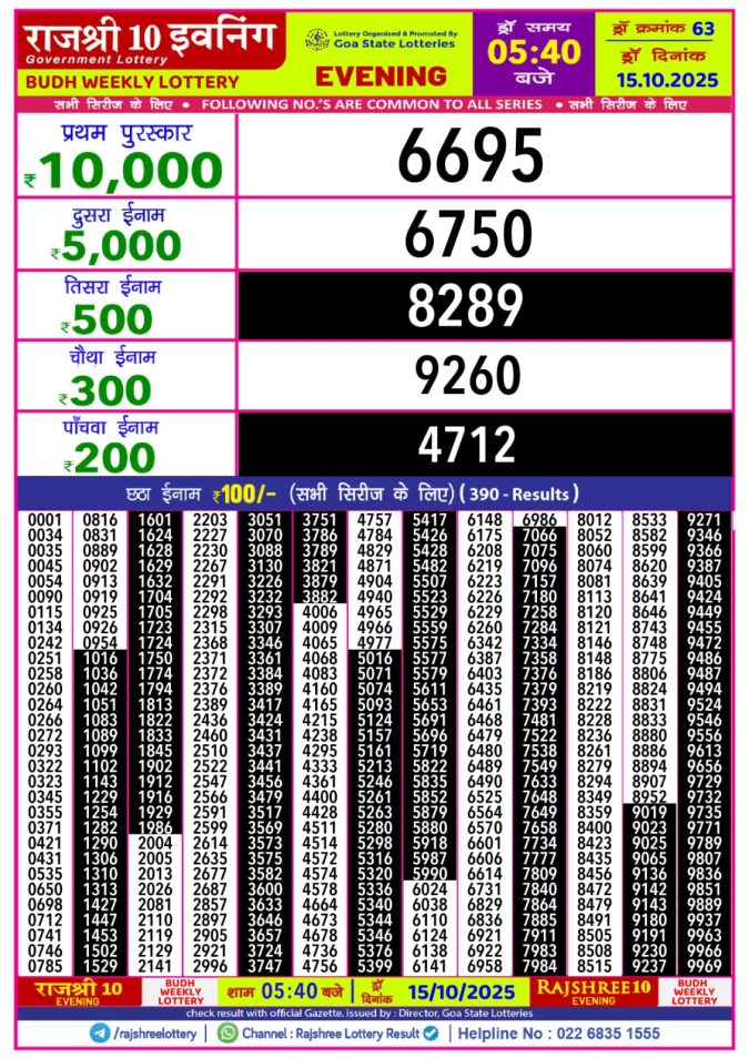 Rajshree 10 Evening Budh Weekly Lottery Result 5.40pm 15/10/2025