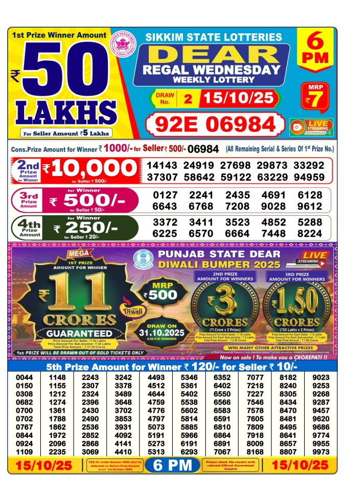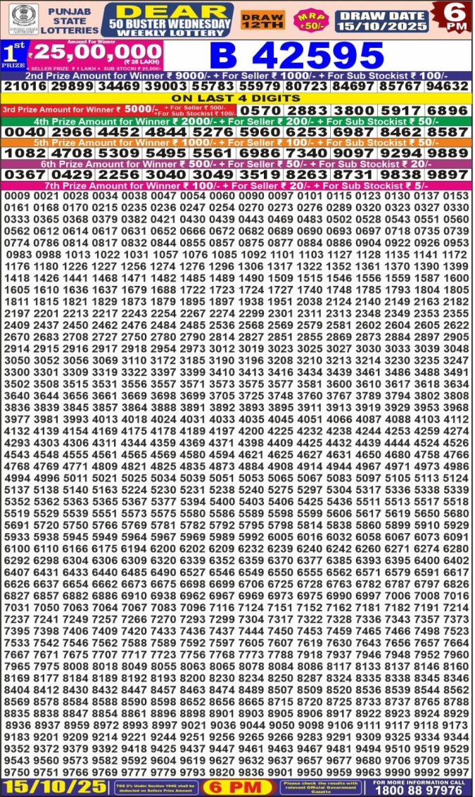 Punjab State Dear 50 6pm Wednesday Weekly Lottery Result 15/10/2025