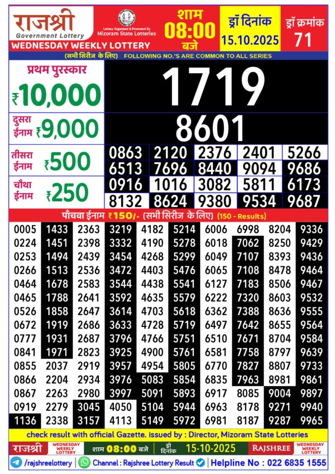 Rajshree Wednesday 8pm Weekly Lottery Result 15/10/2025