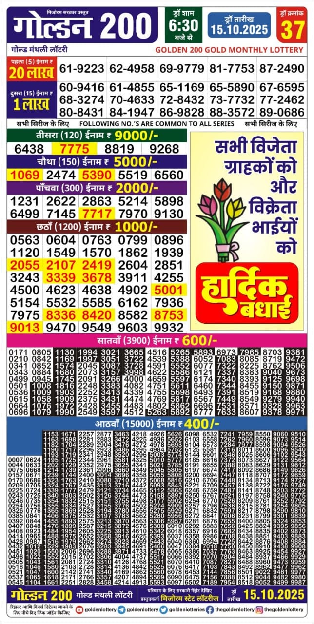 Golden 200 Monthly lottery Result 15/10/2025