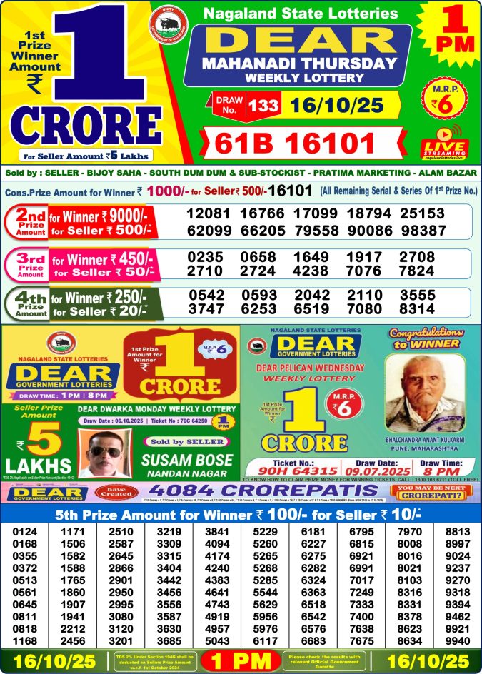 Dear Mahanadi 1pm Thursday Weekly Lottery Result 16/10/2025