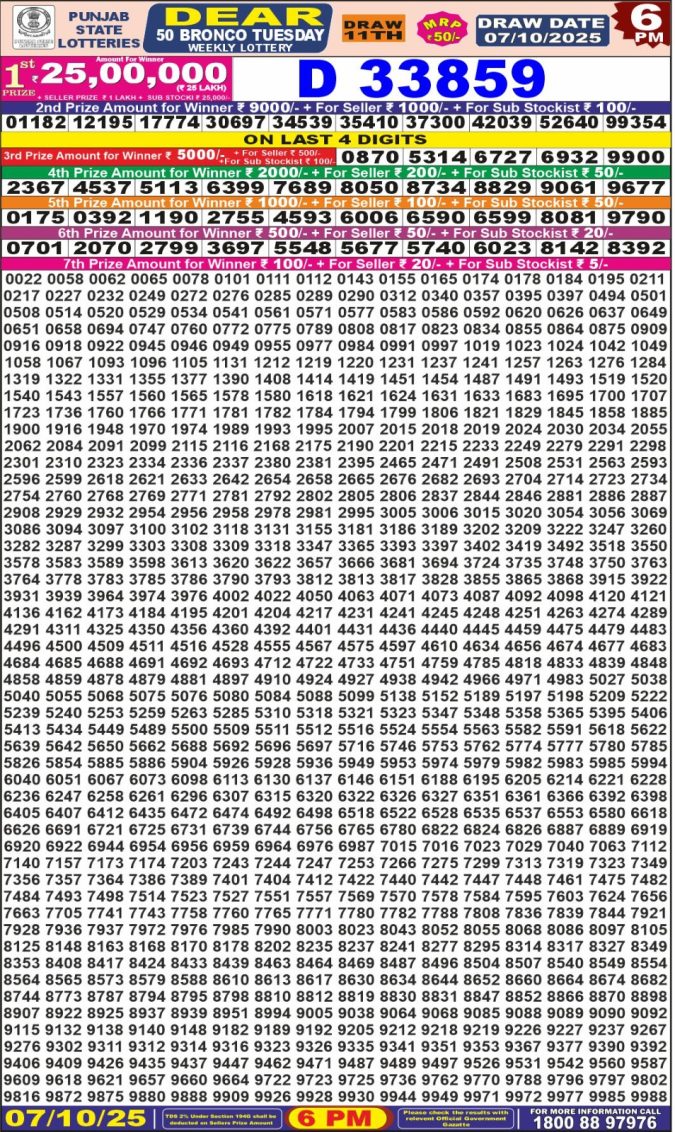 Punjab State Dear 50 6pm Tuesday Weekly Lottery Result 07/10/2025