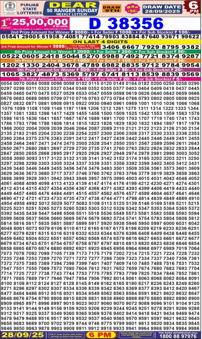 Punjab State Dear50 6pm Sunday Weekly Lottery Result 28/09/2025