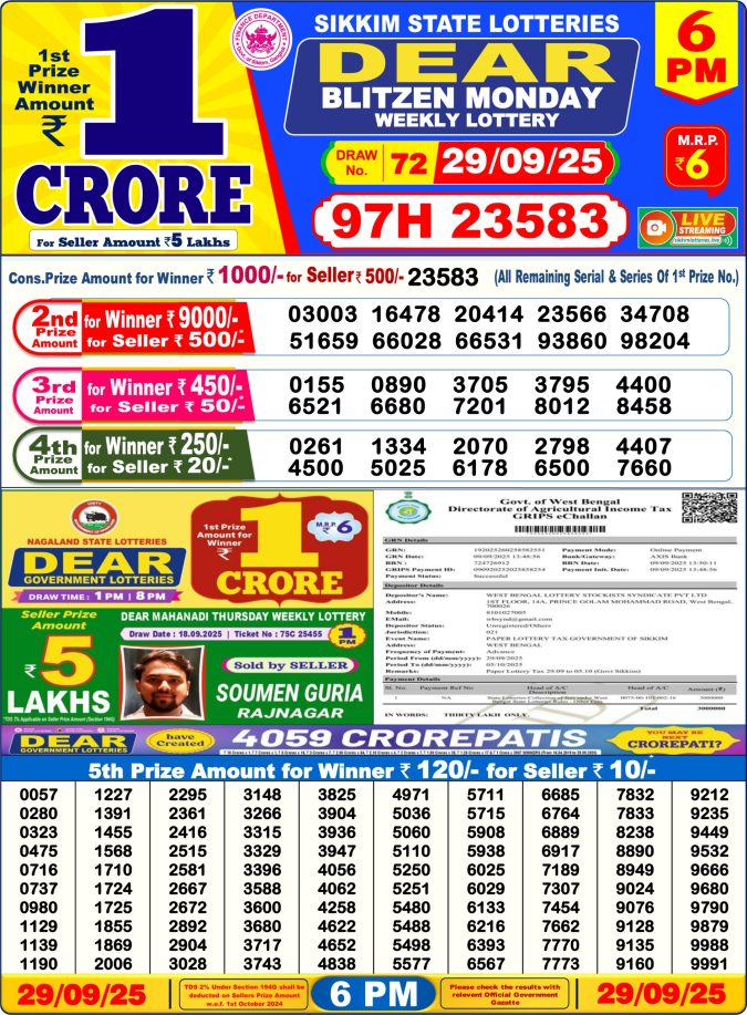 Dear Dwarka Monday Weekly Lottery Result 1pm 29/09/2025