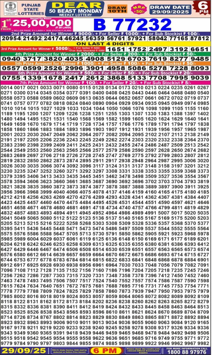 Punjab State Dear 50 6pm Monday Weekly Lottery Result 29/09/2025