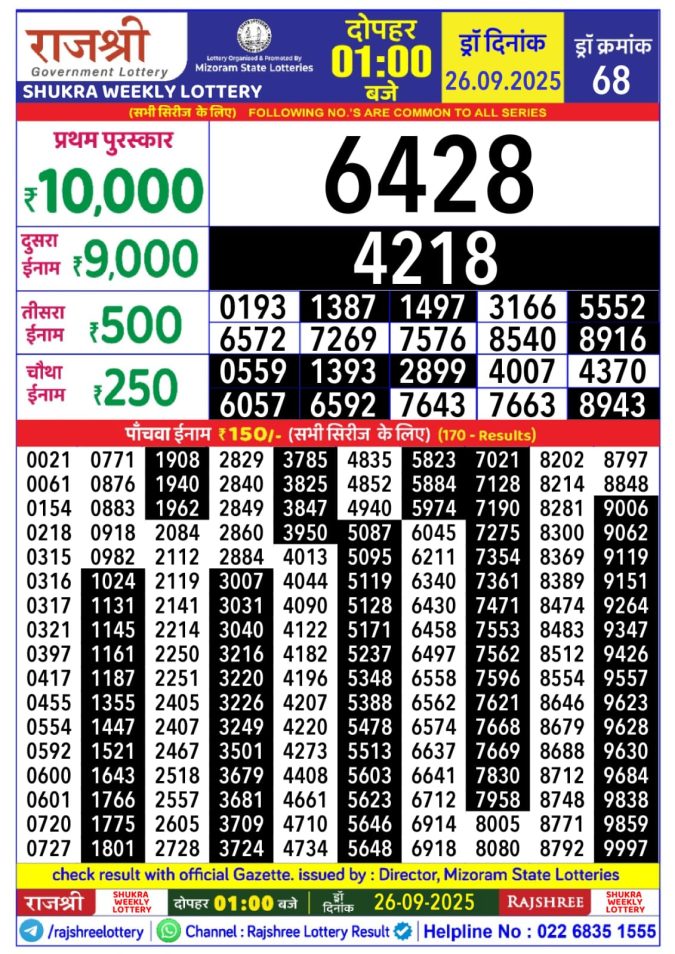 Rajshree Shukra 1pm Weekly Lottery Result 26/09/2025