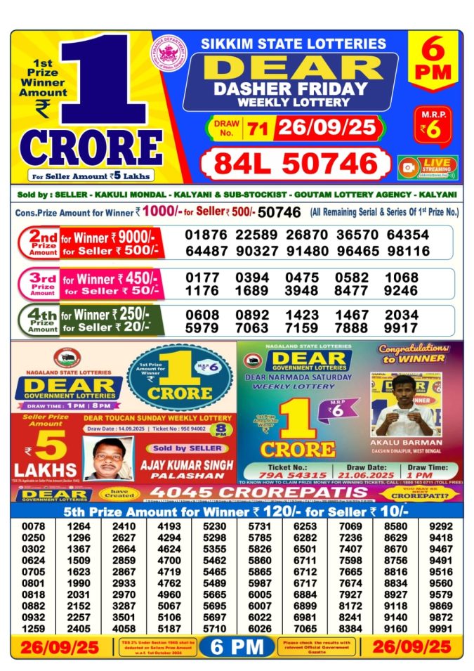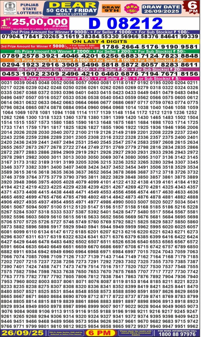 Punjab State Dear 50 Friday Weekly Lottery Result, 6pm, 26/09/2025