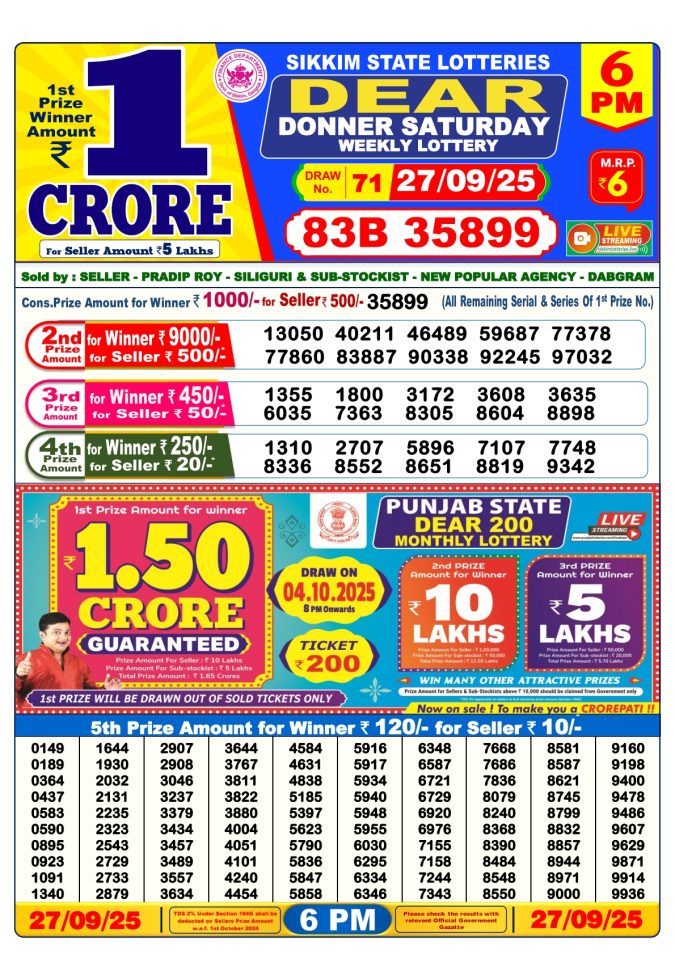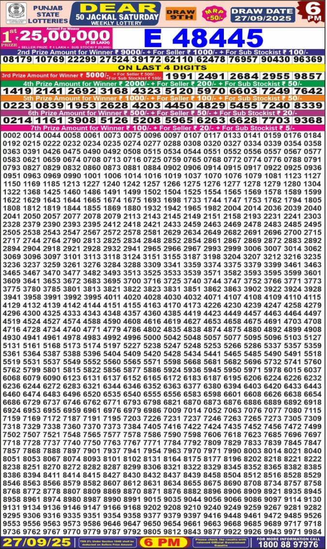 Punjab State Dear50 6pm Saturday Weekly Lottery Result 27/09/2025