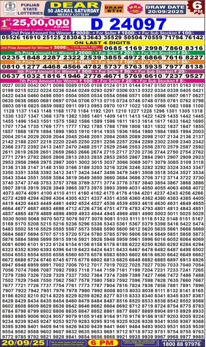 Dear Ganesh Chaturthi Bumper Lottery Result Live 20/09/2025