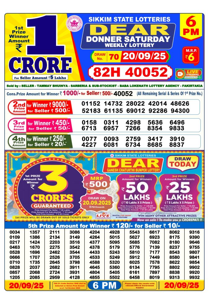 Dear Ganesh Chaturthi Bumper Lottery Results Live Today, 20/09/2025: Grand Prize of ₹3 Crores Announced! Gangtok –…