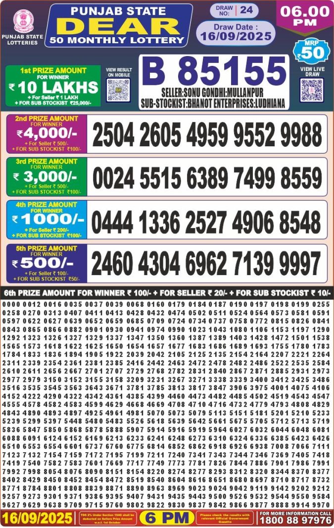 Punjab State Dear 50 Monthly Lottery Result 16/09/2025