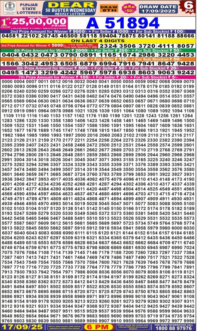 Punjab State Dear 50 6pm Wednesday Weekly Lottery Result 17/09/2025