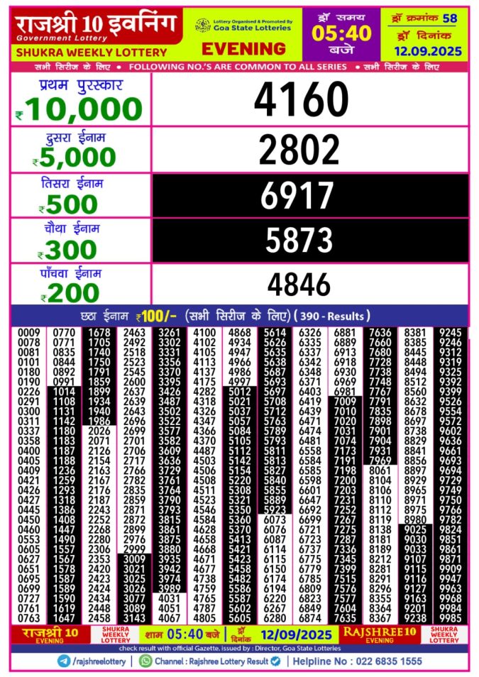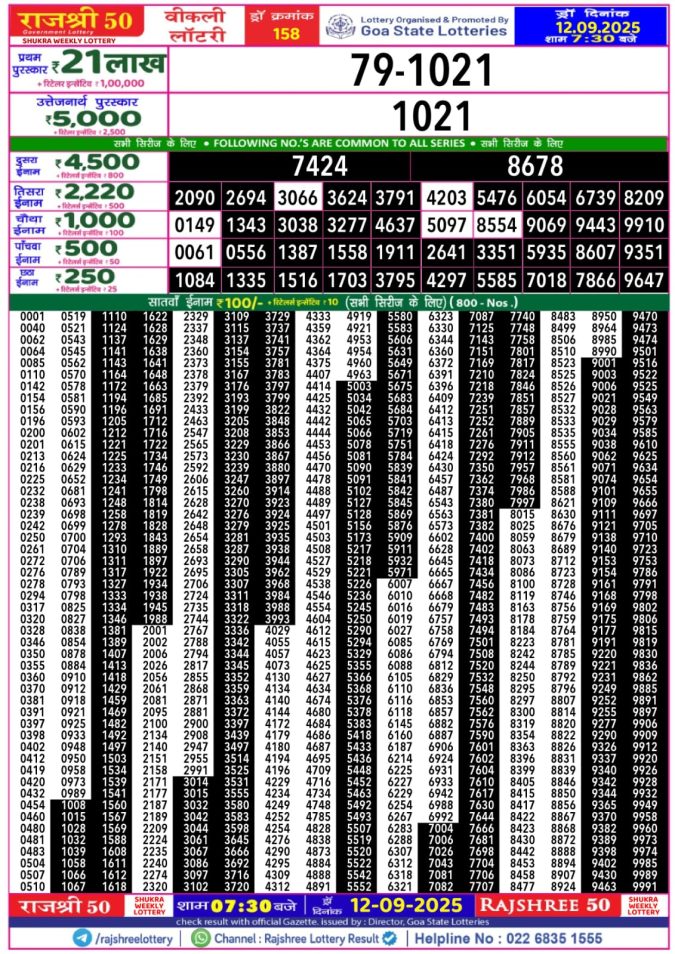 Rajshree Shukra 1pm Weekly Lottery Result 12/09/2025
