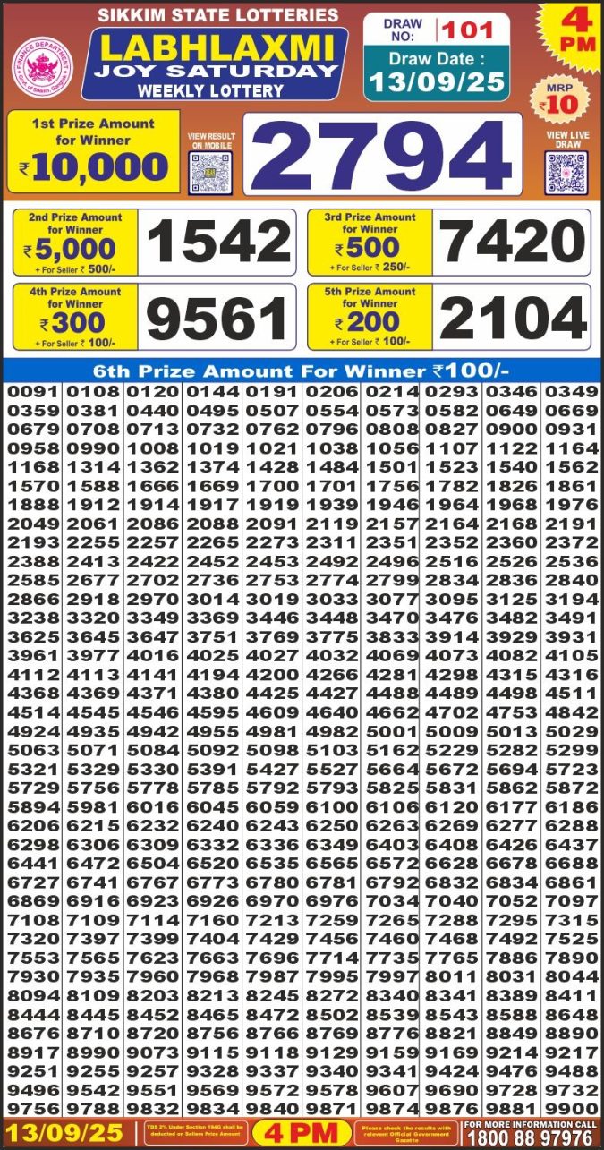 Labh Laxmi Joy 4pm Saturday Weekly Lottery Result 13/09/2025