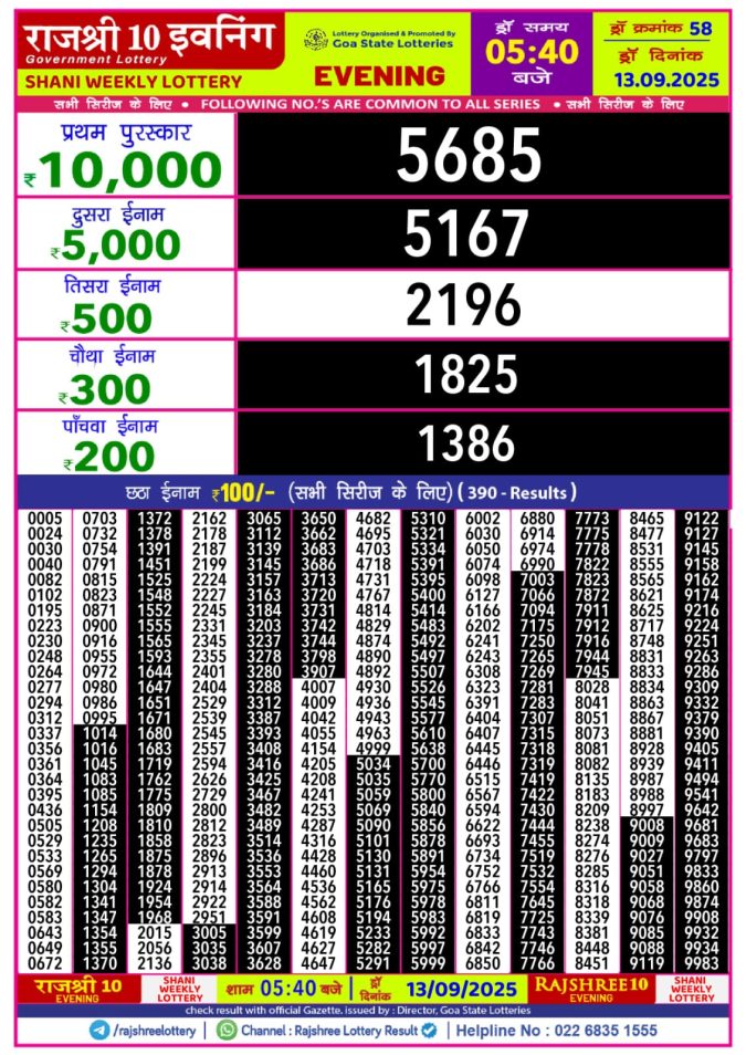 Rajshree 10 Evening Shani 5.40pm Weekly Lottery Result 13/09/2025