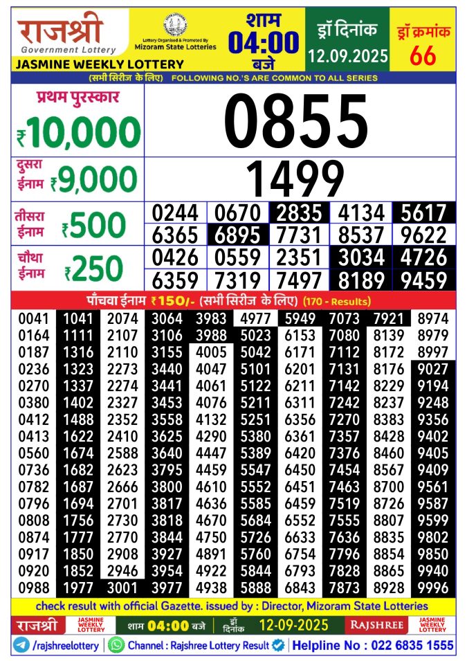 Rajshree Jasmine 4pm Weekly Lottery Result 12/09/2025
