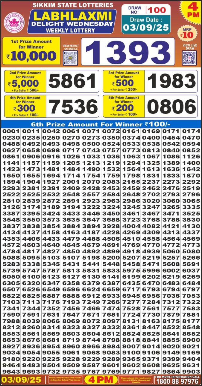 Labh Laxmi Delight 4pm Wednesdday Weekly Lottery Result 03/09/2025