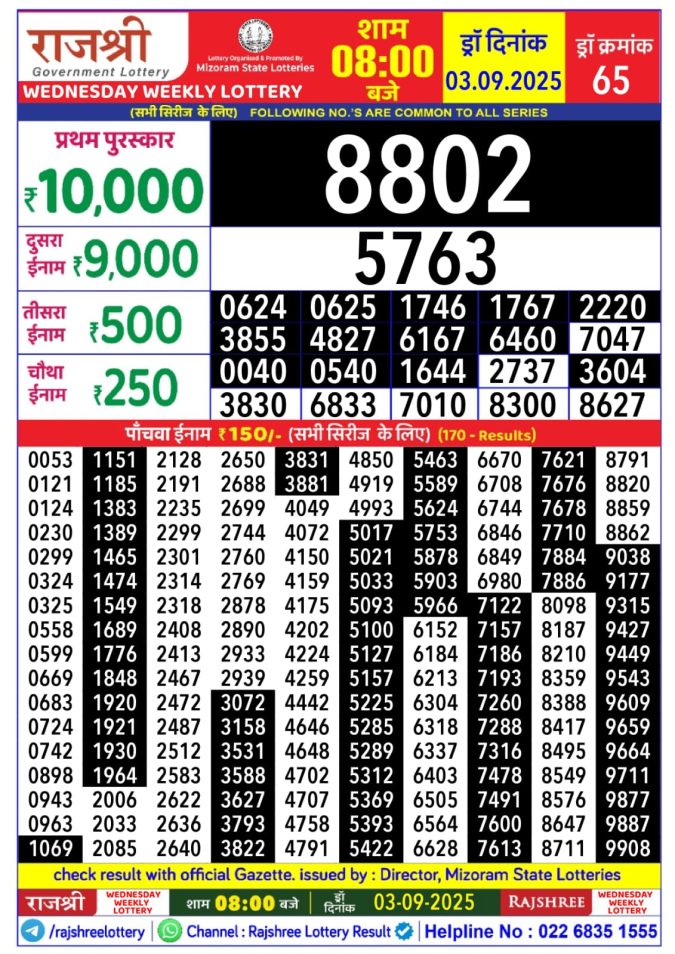 Rajshree Wednesday 8pm Weekly Lottery Result 03/09/2025