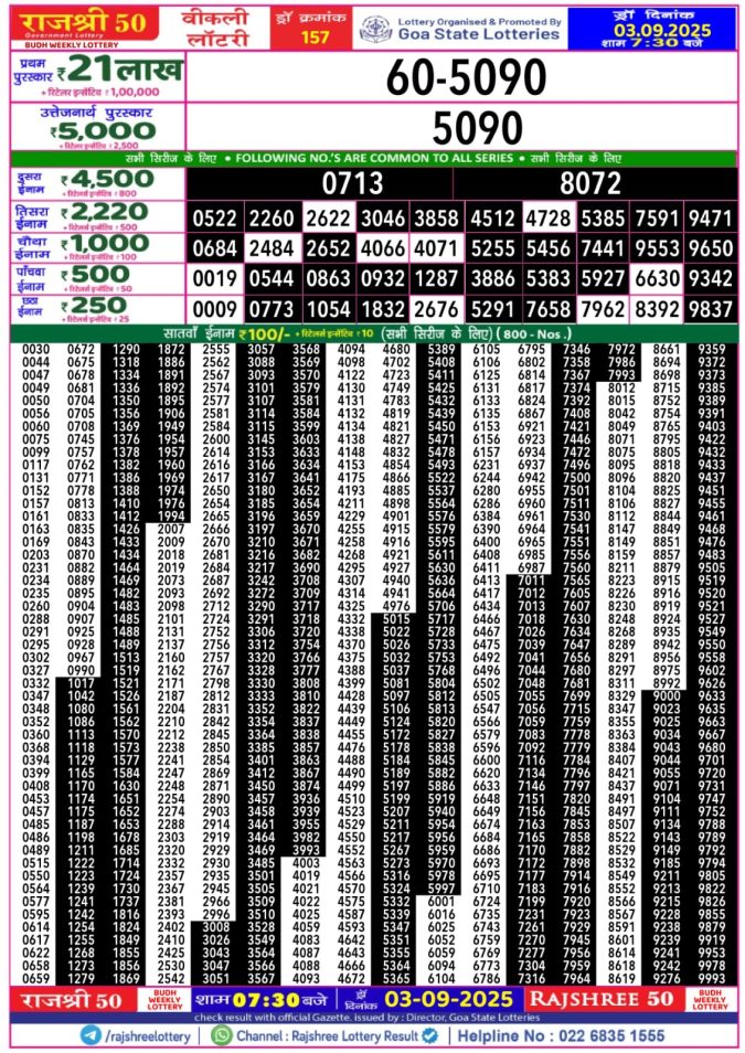 Rajshree Budh 1pm Weekly Lottery Result 03/09/2025