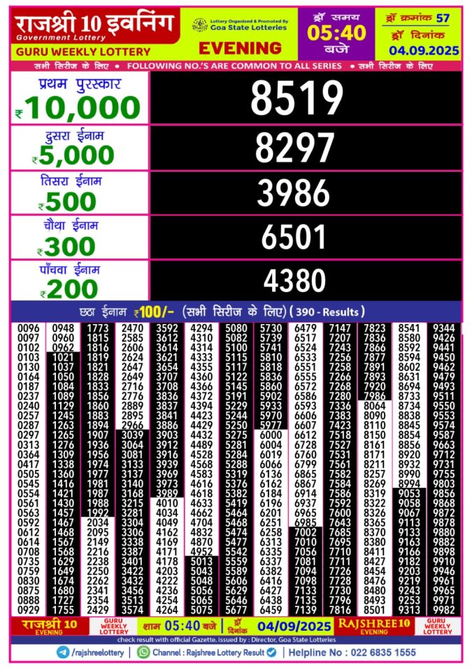 Rajshree 10 Evening Guru 5.40pm Weekly Lottery Result 04/09/2025