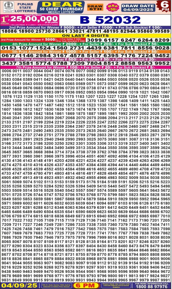 Punjab State Dear 50 6pm Thursday Weekly Lottery Result 04/09/2025