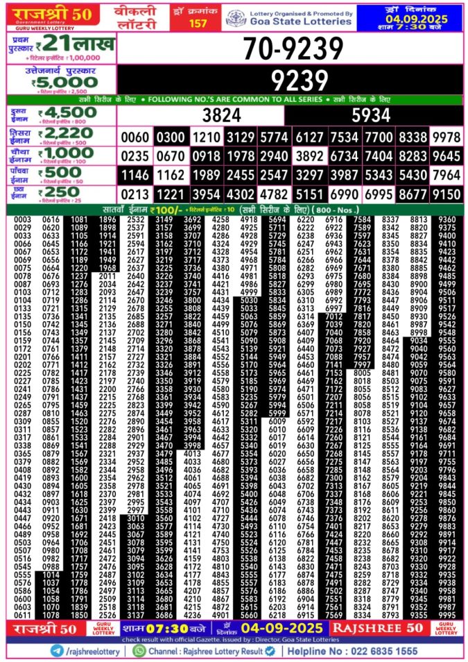 Rajshree Guru 1pm Weekly Lottery Result 04/09/2025
