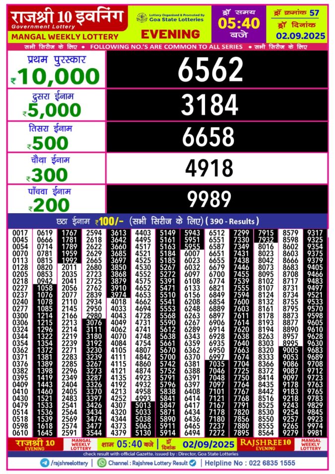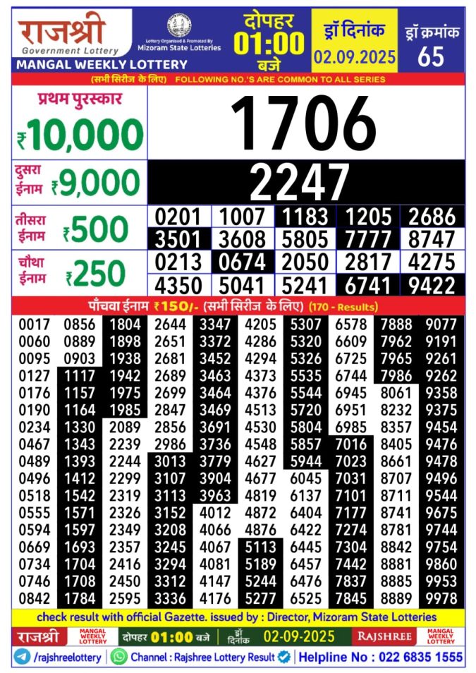 Rajshree Mangal 1pm Weekly Lottery Result 02/09/2025