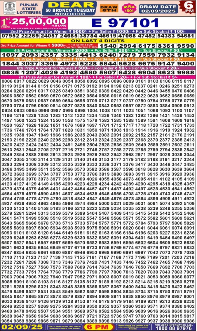 Punjab State Dear50 6pm Tuesday Weekly Lottery Result 02/09/2025