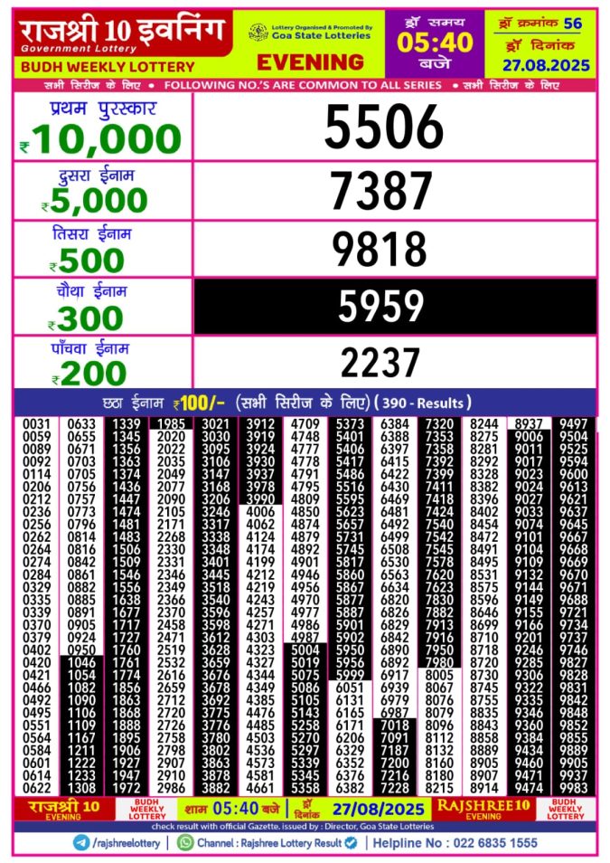 Rajshree Daily 4pm Weekly Lottery Result 27/08/2025
