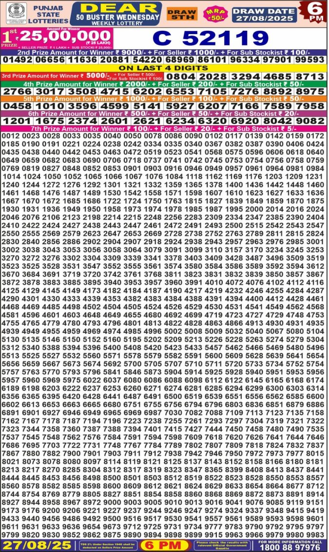 Punjab State Dear 50 6pm Wednesday Weekly Lottery Result 27/08/2025
