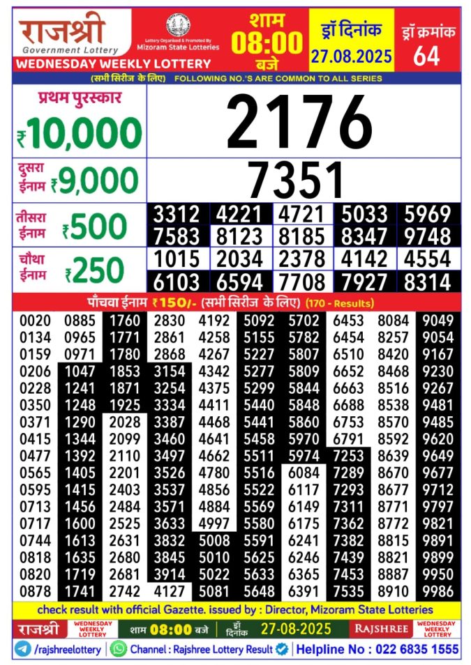 Rajshree Wednesday 8pm Weekly Lottery Result 27/08/2025