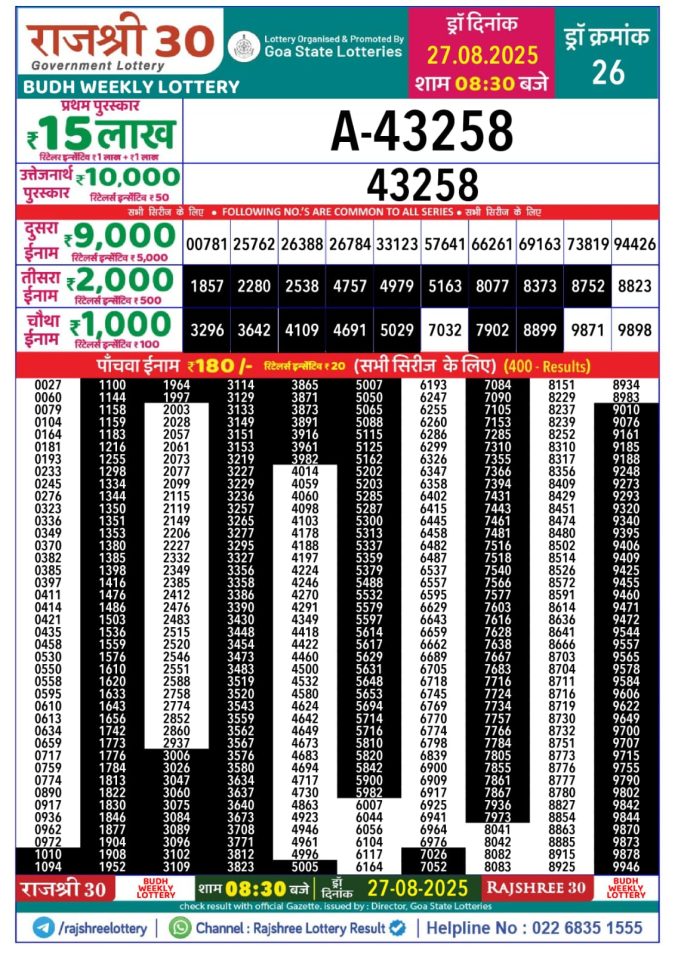 Rajshree 30 Budh Weekly Lottery Result 8.30pm 27/08/2025