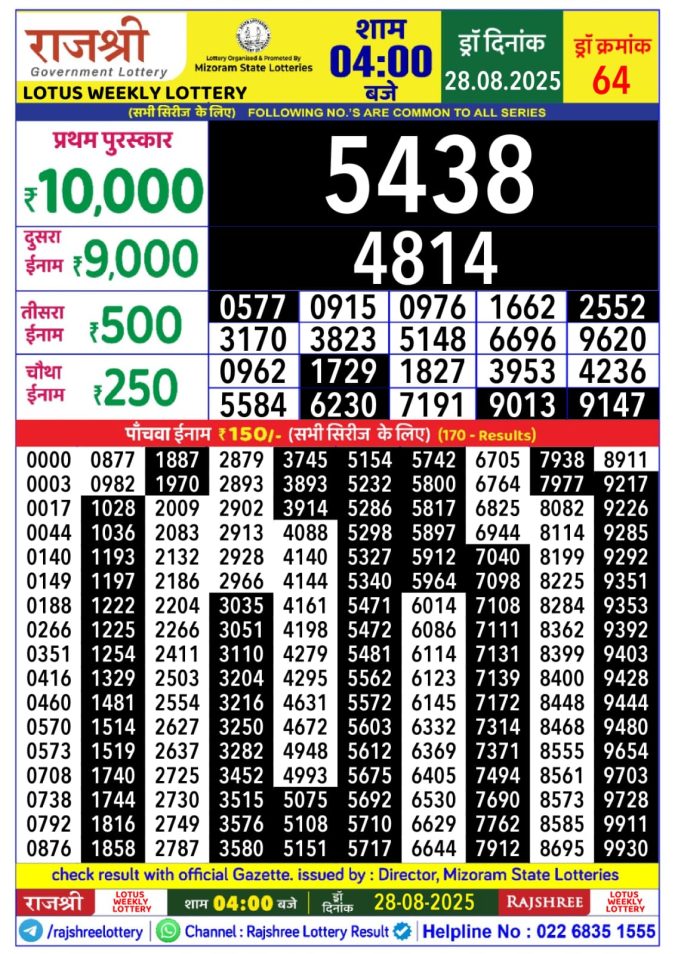 Rajshree Lotus 4pm Weekly Lottery Result 28/08/2025