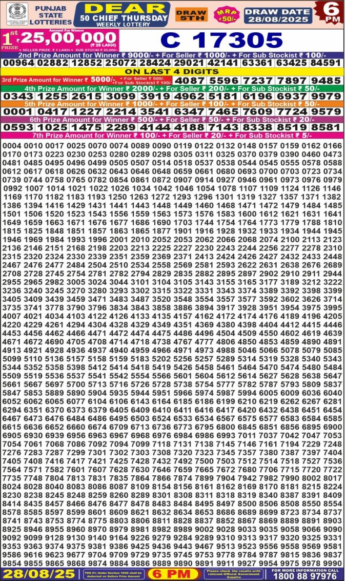 Punjab State Dear 50 6pm Thursday Weekly Lottery Result 28/08/2025