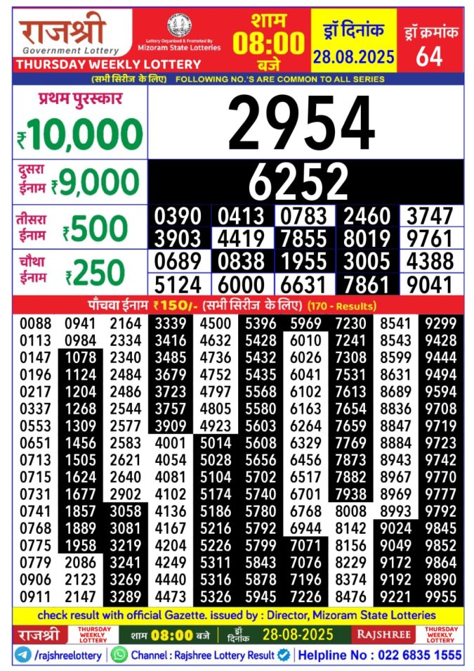 Rajshree Thursday 8pm Weekly Lottery Result 28/08/2025