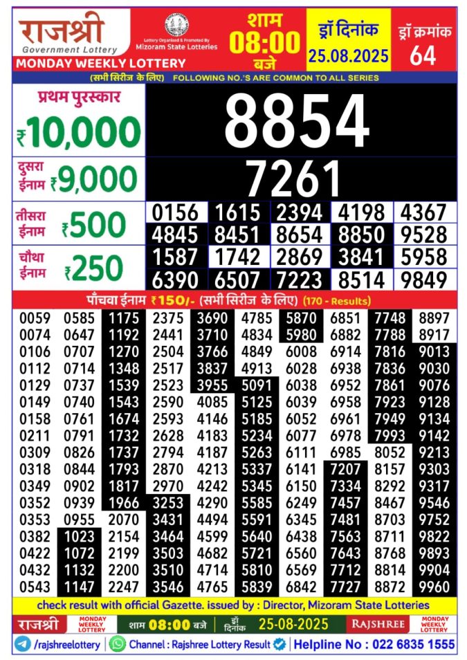 Rajshree 8pm Monday Weekly Lottery Result 25/08/2025