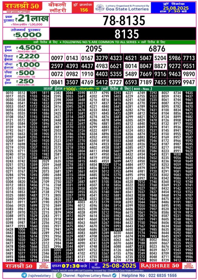 Rajshree 50 Som Weekly Lottery Result 7.30pm 25/08/2025