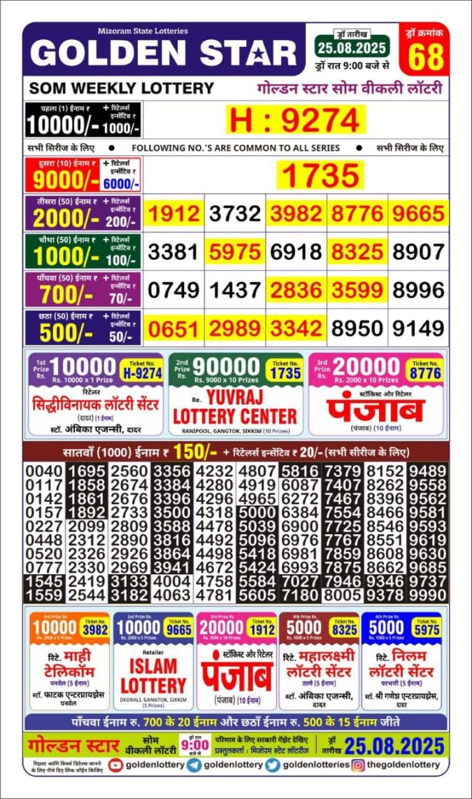 Golden Star Lottery Result Today 9pm 25/08/2025
