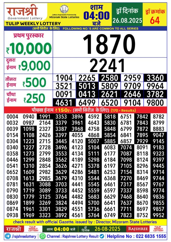 Rajshree Tulip 4pm Weekly Lottery Result 26/08/2025